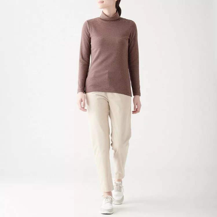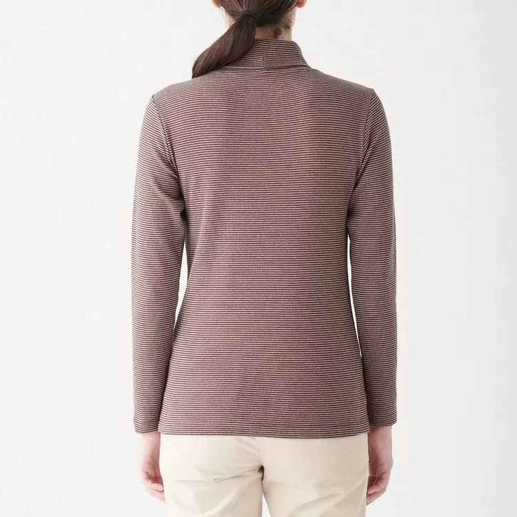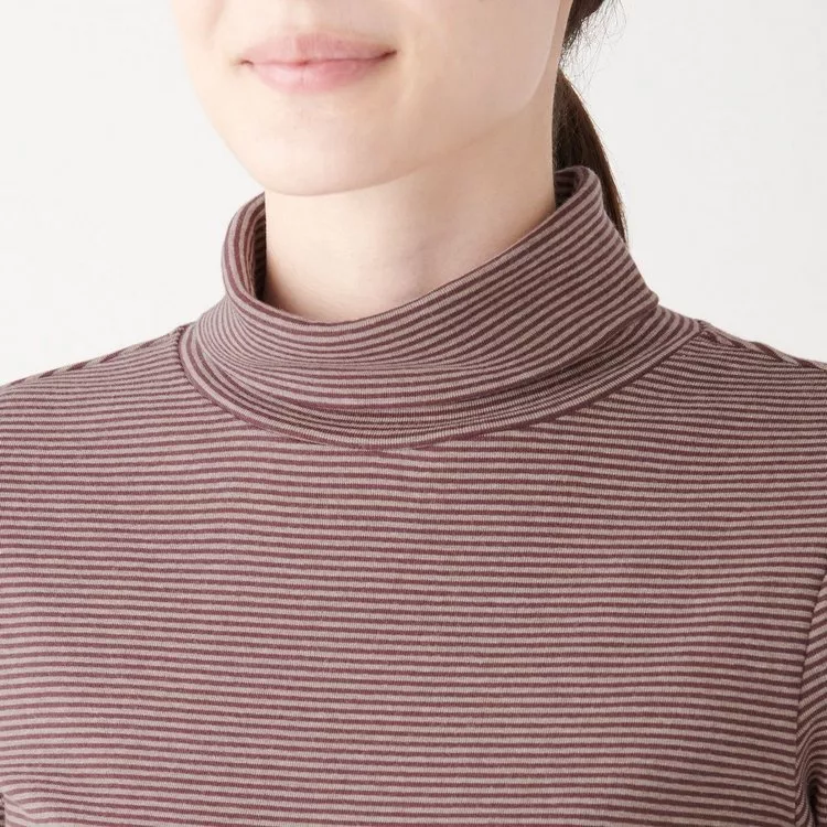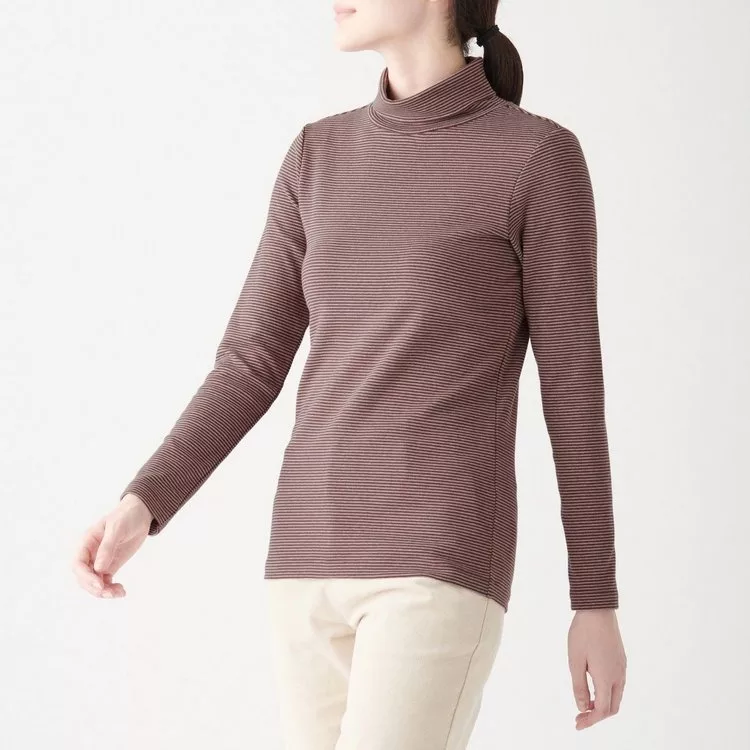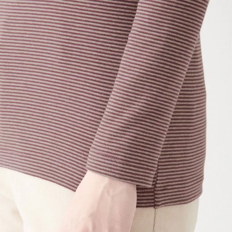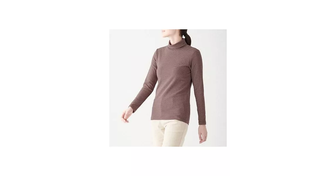 商品描述: [MUJI無印良品]女有機棉混彈性針織橫紋高領T恤S暗紅橫紋