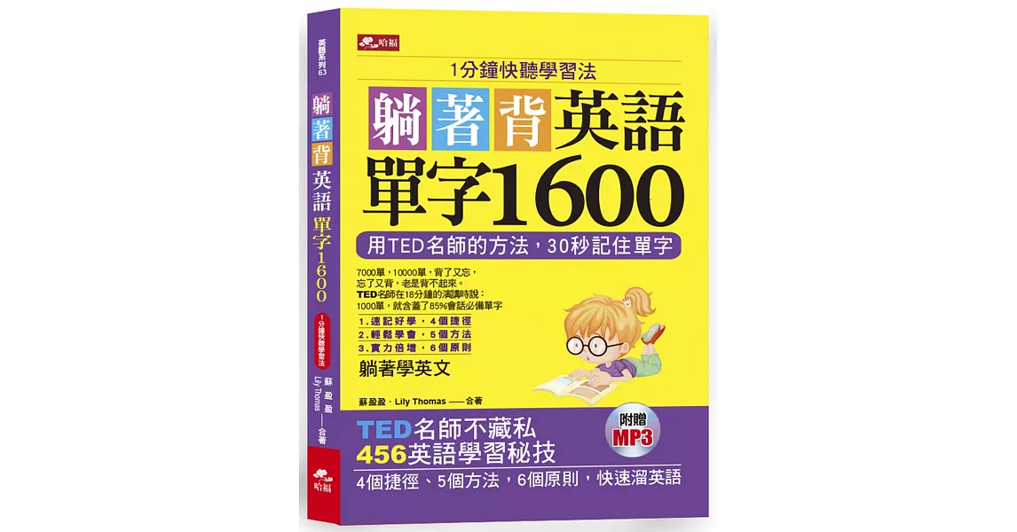 商品描述: 書名:躺著背英語單字1600:1分鐘快聽學習法(附MP3),語言:繁體中文,ISBN:9789869916110,頁數:272,出版社:哈福企業,作者:蘇盈盈,Lily Thomas,出版日期:2020/06/17,類別:語言學習