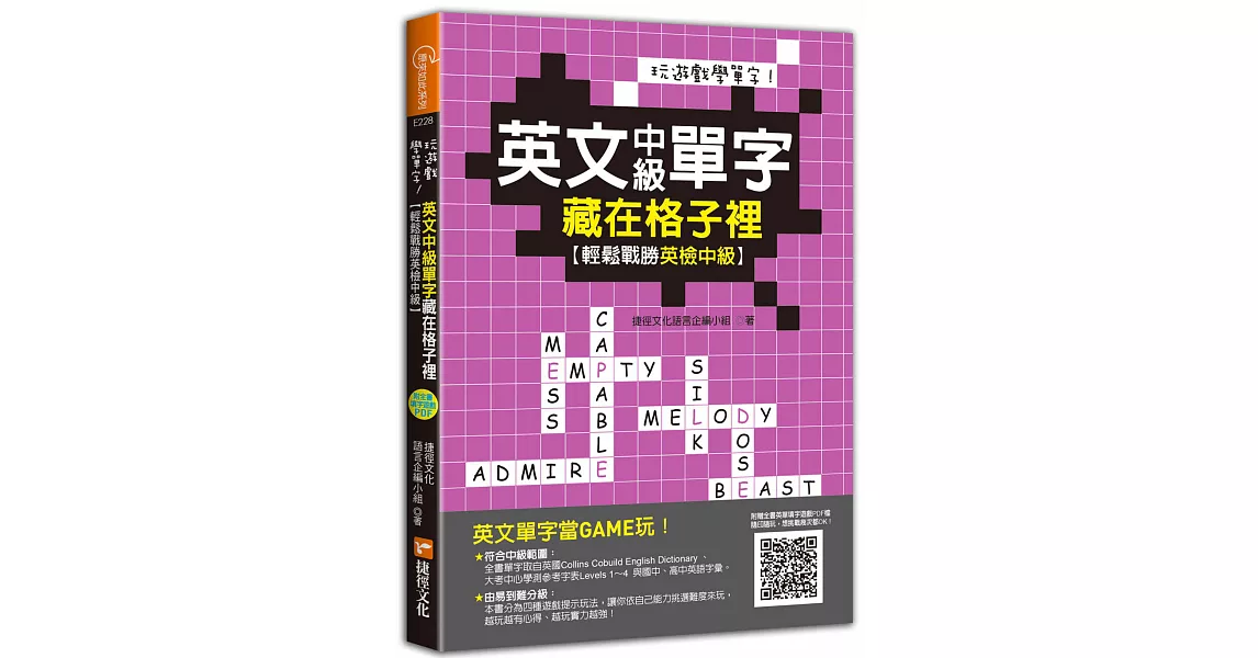 博客來-玩遊戲學單字!英文中級單字藏在格子裡 :輕鬆戰勝英檢中級!(超值附贈單字填字遊戲下載即玩QR code)訂購網址: https://www.books.com.tw/exep/assp.php/87926/products/0010861120?utm_source=87926&utm_medium=ap-books&utm_content=recommend&utm_campaign=ap-201905