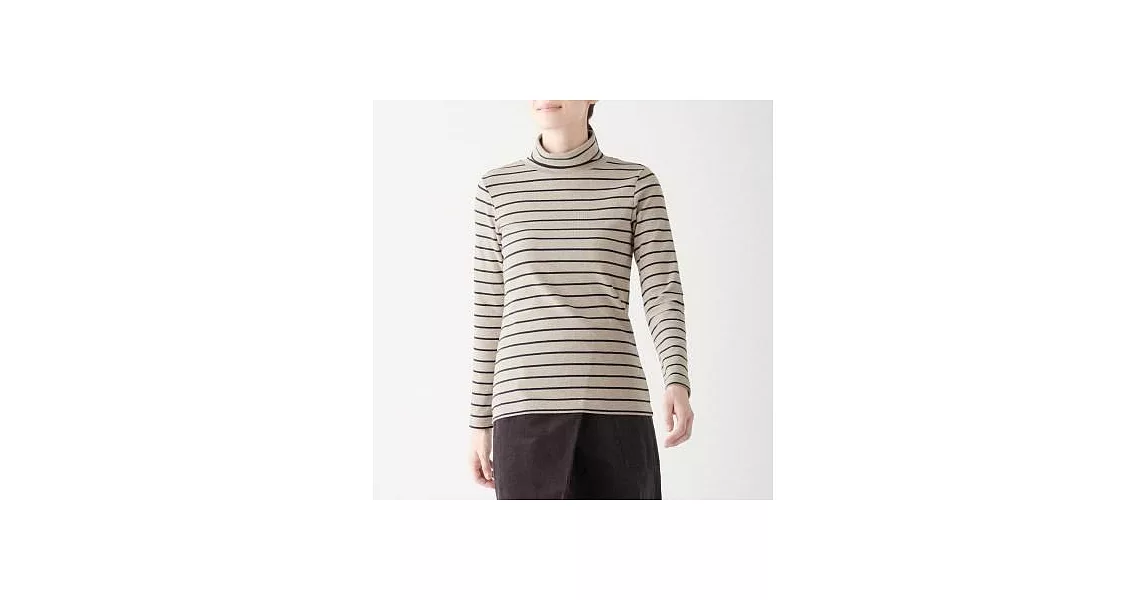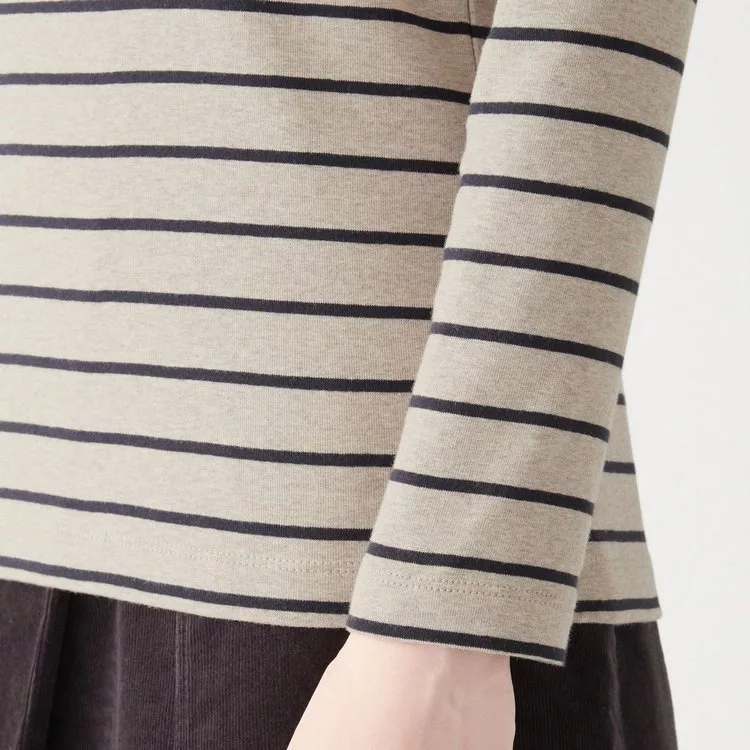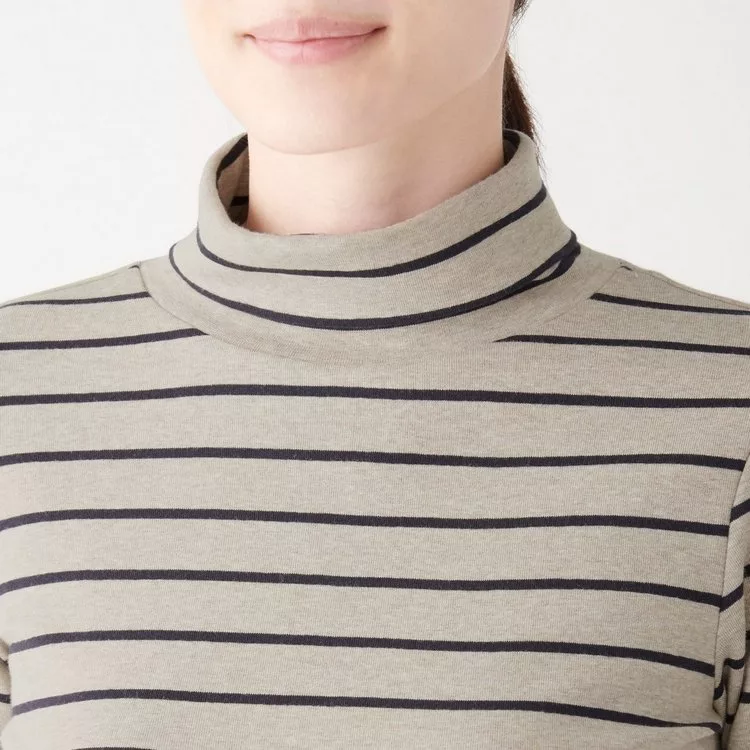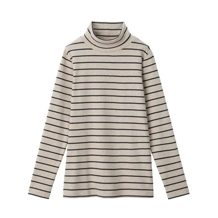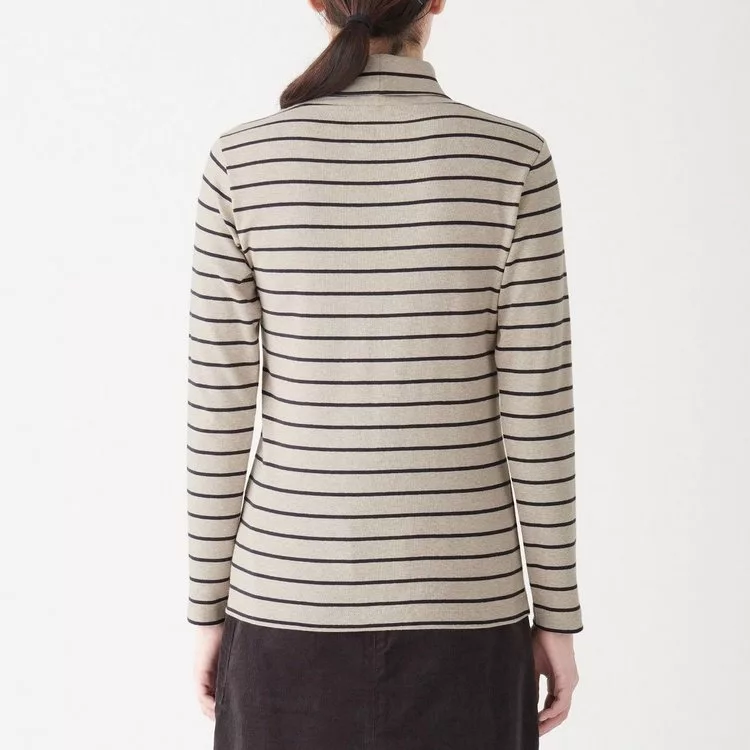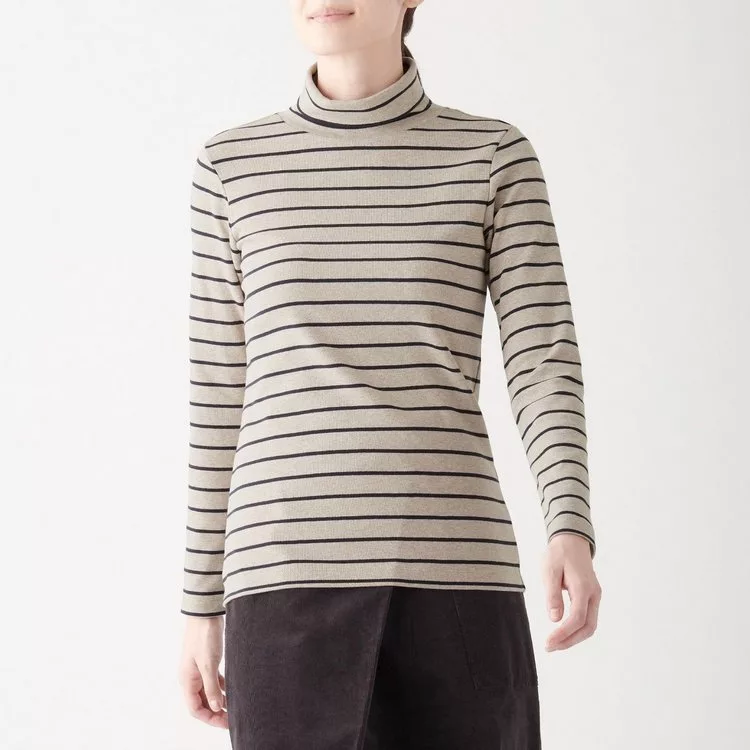 [MUJI無印良品]女有機棉混彈性針織橫紋高領T恤S米色直紋