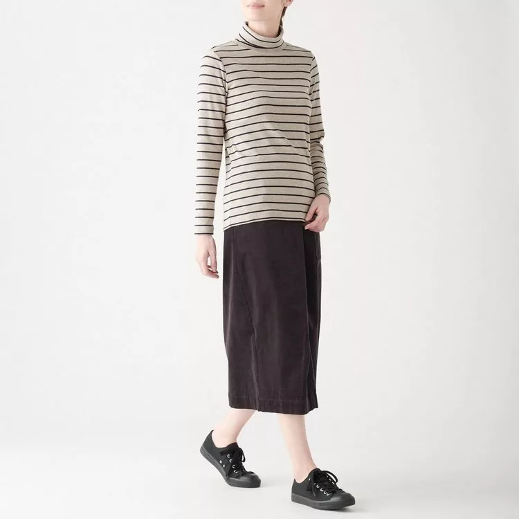 [MUJI無印良品]女有機棉混彈性針織橫紋高領T恤S黑橫紋